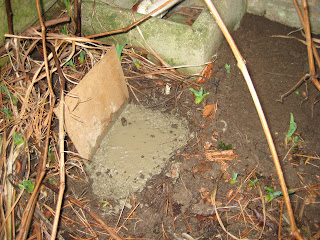 Yesterday I finished excavating the hole for it to rest its weight on, filled it with 20kg of cement, and luckily I found the edge of the soil pipe, so some carefully placed ply shuttering down the side has guaranteed I”ve missed it.